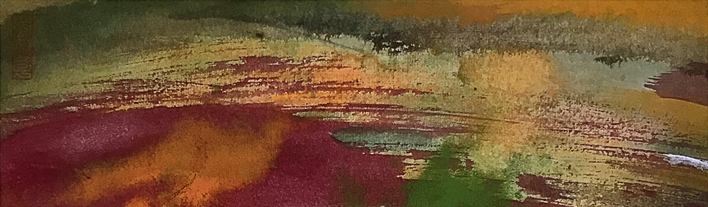 青青河边草,草上捉蜻蜓。好多好多的红蜻蜓,在微风下漫天飞舞。透明的翅膀忽隐忽现,所经之处,抖落一地阳光。这是一代人的童年,一段无法抹除的回忆!好友吴兄知我画此,大赞。告诉我:“其喜欢在水边、草丛中觅食,年少时颜色淡,成年时颜色深,最好画时能体现,非常非常期待!”这么多年,竟然记得!是啊,藏在记忆深处的美好怎会忘记?浓墨、清水,在白色的宣纸上反复撞击,大面积深浅不一的墨痕和几道靓丽的金色共同营造出一个神秘而又深邃的意境,氤氲满纸。二个画面,深红、浅红蜻蜓各一与其中,对比强烈,非常醒目……哦,“红与黑”,才是我想要表达的主题。表达什么?没有答案。不是矫情,是实话!