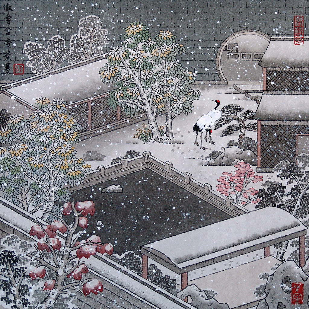 叶寒兄的雪景山水,主要是以表现江南园林为题材的:几进厢房,一池净水,顽石居其畔,松柏掩其间,白雪覆盖其上,静谧而肃穆,既神秘,又秀丽,实在是一个理想的雪国世界。叶寒兄的雪景山水有工笔的工整,有写意的轻松,用笔平和气静,用墨淡雅恬静,用色古朴清丽。画面经营惨淡,布置有致,最难处便是在渲染过程中的那份心境,能够做到清而不薄,厚而不浊。这些细微处似乎决定了画面的格调。在现今,画雪者甚多,以叶寒兄这般画雪者不多,而能画心中之雪者,能有几人? 国家画院 何加林